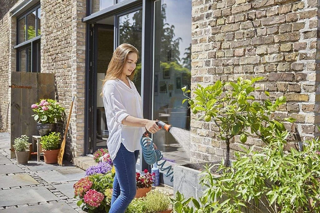 The enclosed Water Sprayer lies well in the hand, the water quantity can be infinitely adjusted and the impulse trigger can be set if desired. Automatic roll-up of hose no manual rolling required The hose automatically coils back up after use to its original shape. No more troublesome rolling and unrolling. Never carry watering cans again.